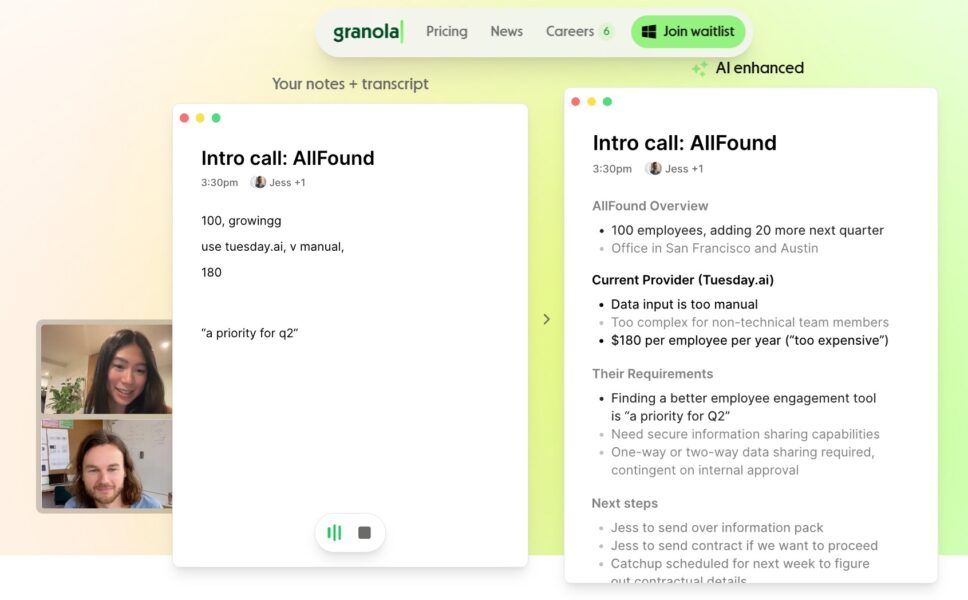 • Smart Note-Taking: Granola AI notepad uses AI to transcribe and summarize meeting discussions in real time. It captures key points, action items, and decisions, ensuring nothing slips through the cracks.